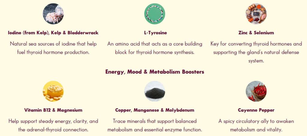 Thyrafemme Balance is formulated with a balanced combination of natural herbs, vitamins, and minerals carefully selected to support women’s overall well-being. These ingredients work together to help maintain inner balance, daily energy, and the body’s natural functioning